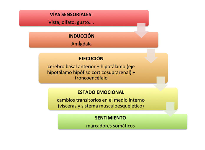 Para entender cómo pasa el amor de ser una emoción visceral a un sentimiento complejo, es necesario hacer un recorrido por las áreas corporales y cerebrales involucradas en este proceso. William James definía las emociones como “una respuesta a las experiencias y estímulos del entorno, a partir de la cual el sistema nervioso autónomo crea respuestas fisiológicas (tensión muscular, lagrimeo, aceleración cardio-respiratoria…)”. Es entonces cuando el nervio vago recoge todas las sensaciones de los biomarcadores abdominales y torácicos, los transporta a través del tronco del encéfalo y terminan en el cerebro, donde se cognitivizan. A modo de resumen podemos fijarnos en la siguiente imagen: